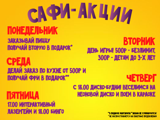 — А если захочется есть? Внутри «Сафи-Парка» работает семейное кафе. Горячая пицца из печи, вкусные блюда, закуски, детское меню.
