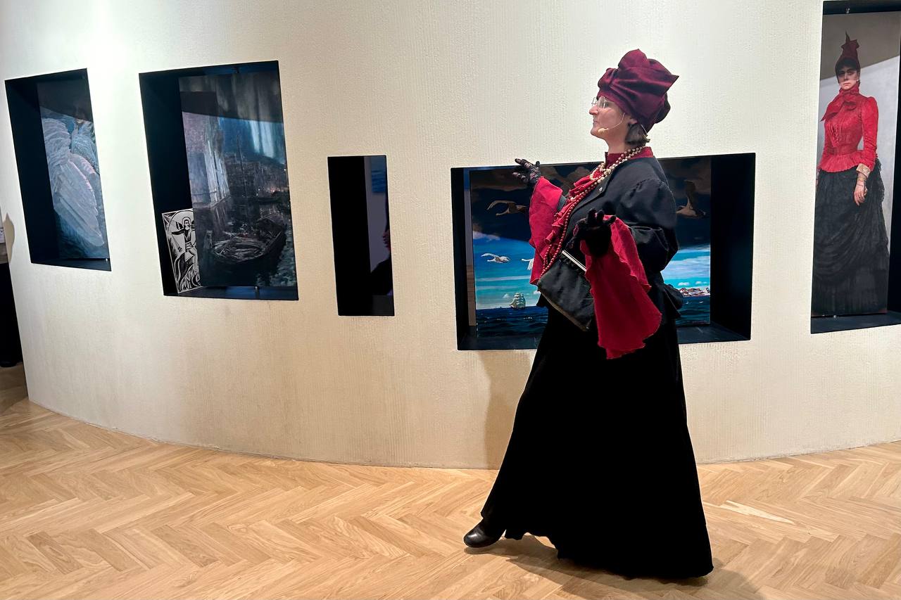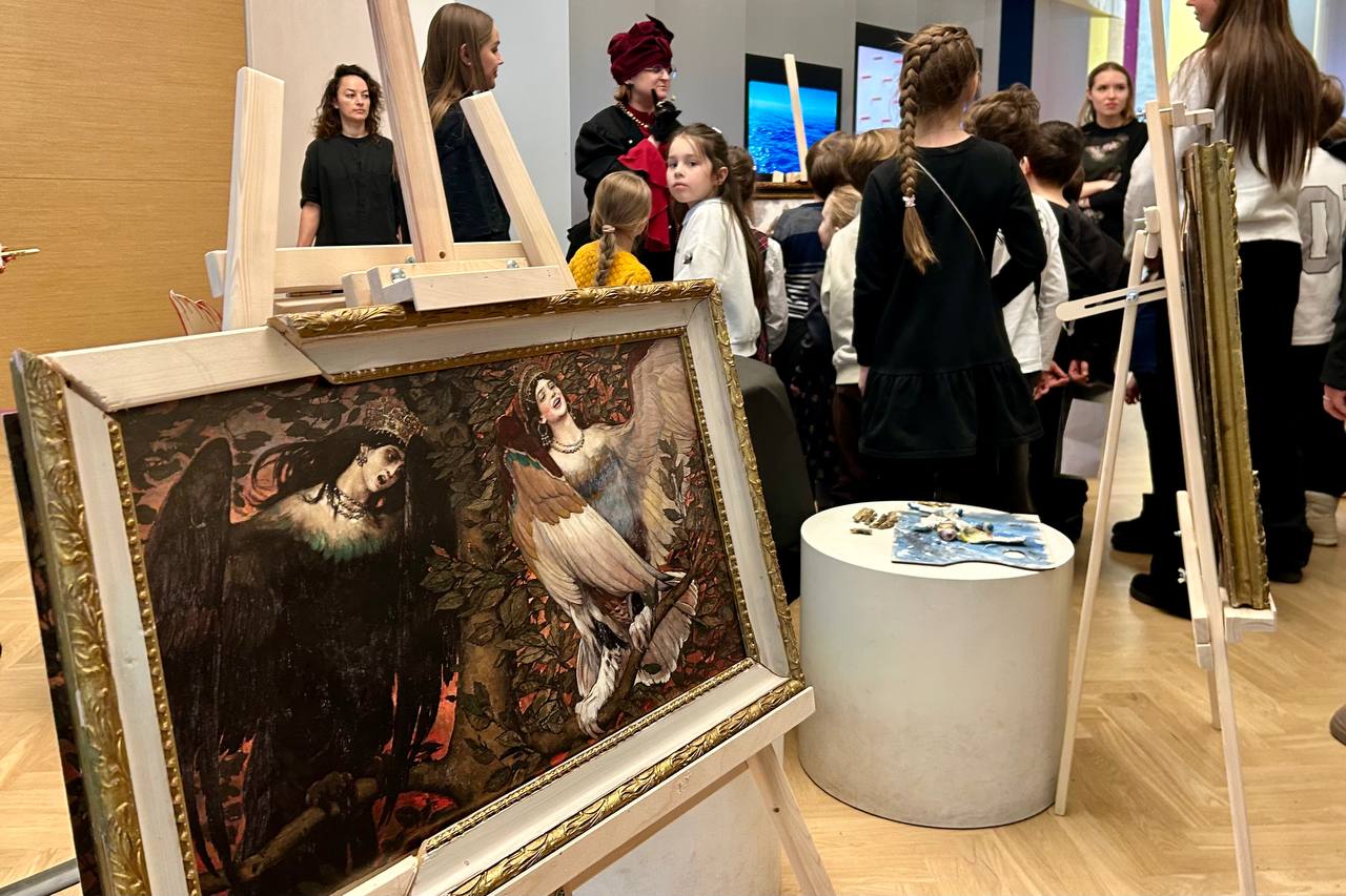 А экскурсовод уже уводит ребят в Детский музей. Он мягко подготавливает юных зрителей к постановке: рассказывает про образ Люта (серого волка), отмечает разницу между мифическими птицами Сирином и Алконостом. Всё это — на примере реальных картин. Но вот из соседнего зала начинает звучать флейта: русалка заманивает гостей — и грань между реальным и художественным стирается.