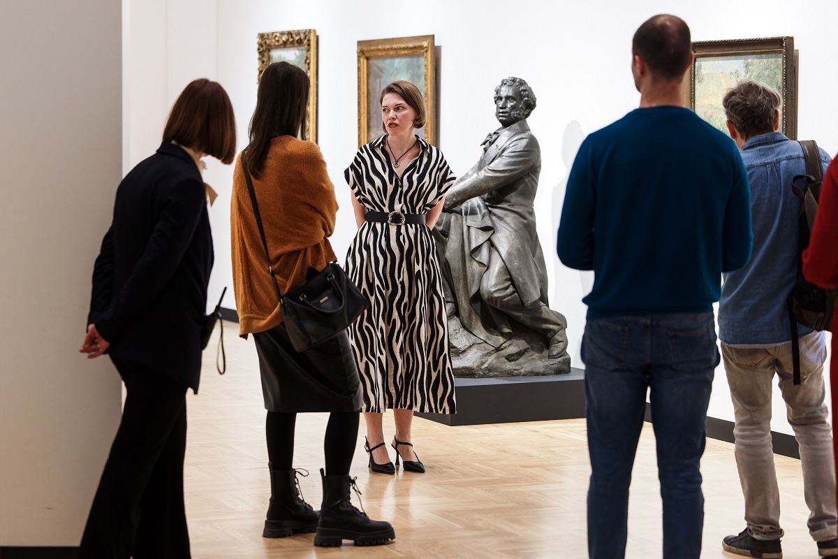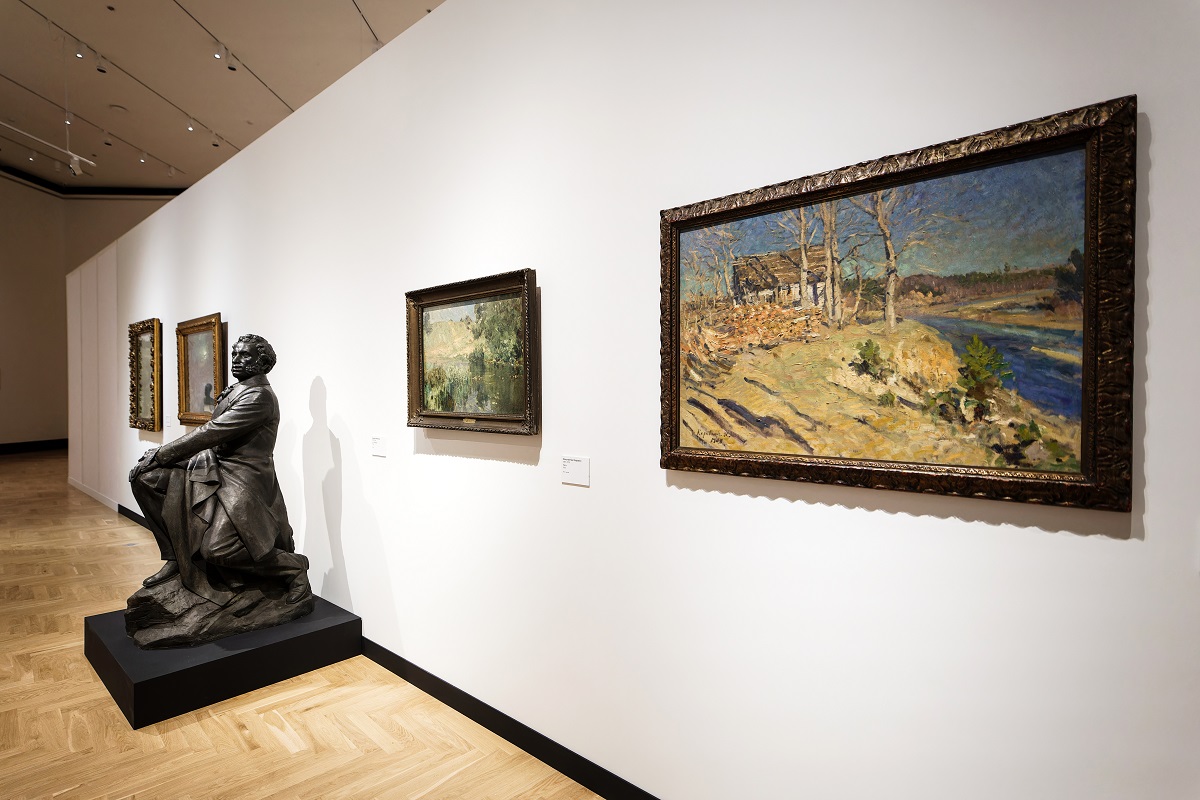 Из города перебираемся на природу. В зале представлены картины «русского импрессиониста» Константина Коровина. Полотна охватывают разные годы творчества — от 1880-х до 1920-х, так что можно проследить изменения в стиле и манере письма. А дополняет лиричные мотивы скульптура Александра Пушкина работы Матвея Манизера.