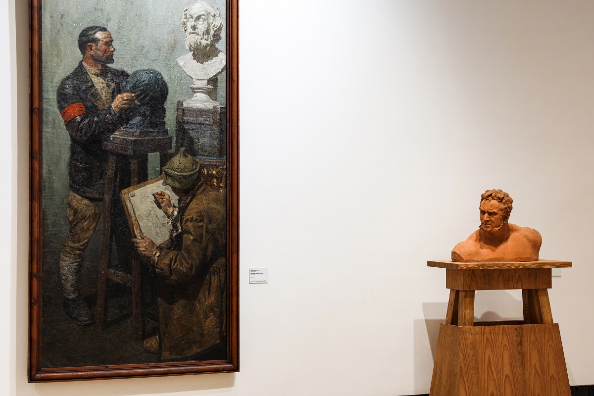 Завершается выставка темой искусства. Зал представляет собой импровизированную мастерскую художника: скульптуры стоят на мольбертах, словно над ними только что работали. Подсмотреть за творческим процессом можно на полотнах Богородского и Коровина. И завершающий акцент — колоссальное полотно Гелия Коржева «Рабочая студия. Гомер» и бюст работы Манизера. «Два этих произведения звучат как ода мастерству. Художник обучает будущие поколения и вдохновляет их на то, чтобы становиться творцами в самом высоком смысле этого слова», — отмечает Екатерина Илюшкина.