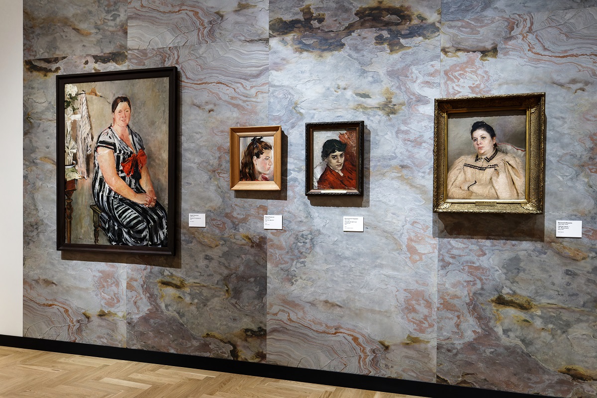 Особое внимание заслуживает и оформление выставки от бюро PS Culture. Белые стены дополняют массивные вставки из срезов натурального итальянского камня. Где-то он добавляет суровости, где-то — декоративности, а порой размывает грань между картиной и зрителем. Из этого же материала выполнили банкетки, так что получится буквально прикоснуться к одной из составляющих экспозиции.