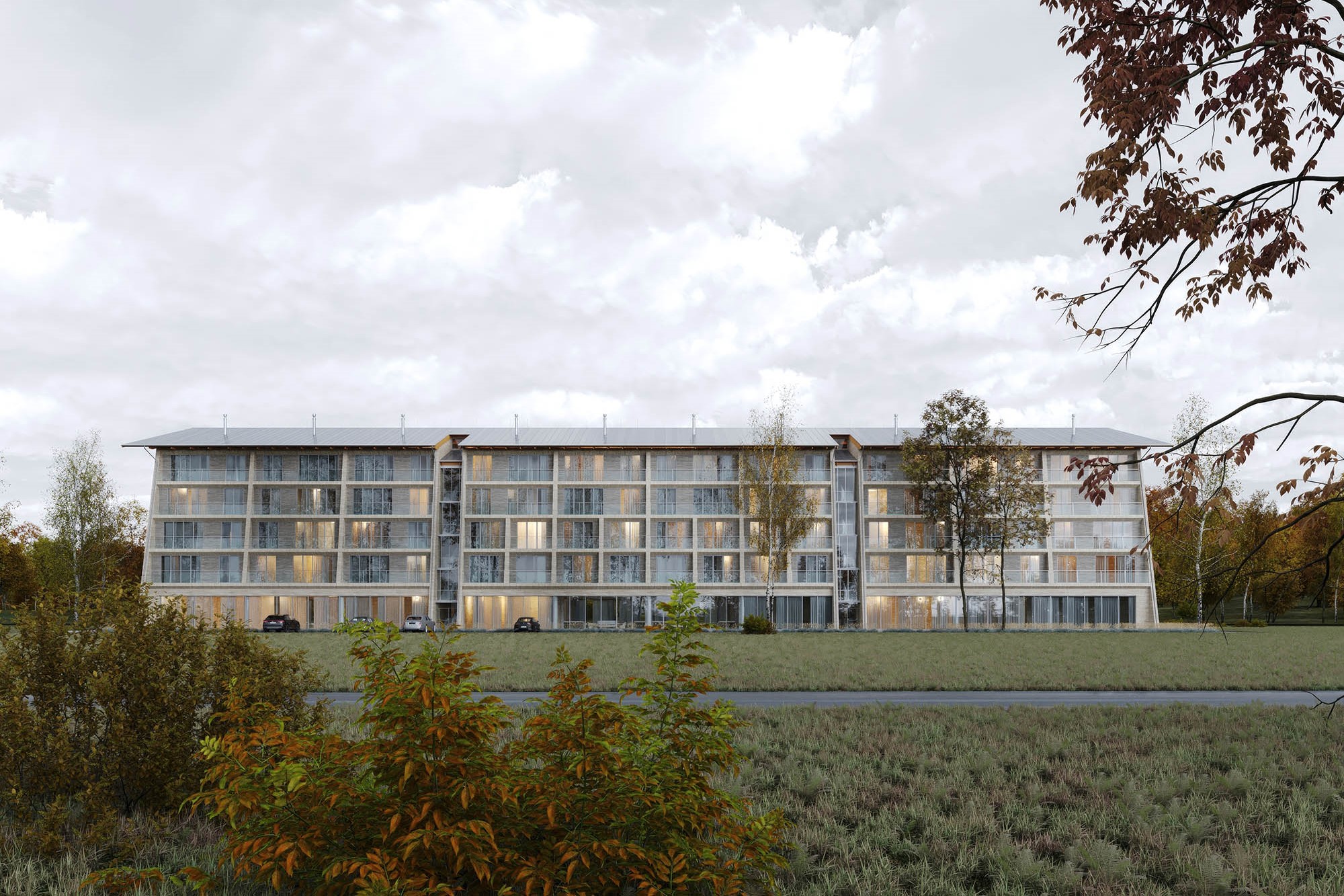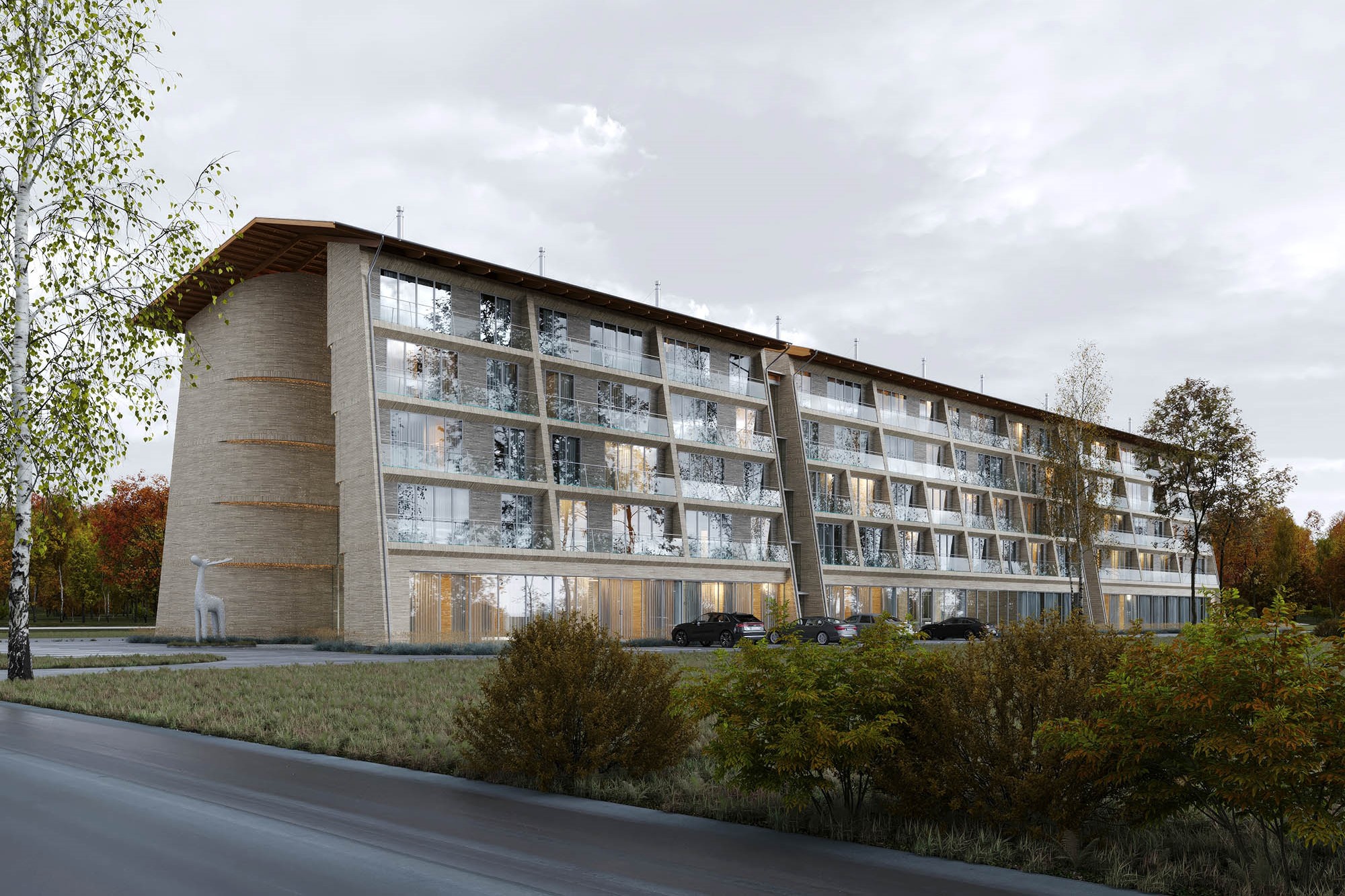 На Куршской косе хотят построить пятиэтажный комплекс апартаментов. Проект здания опубликовали на сайте архитектурного конкурса «Золотая капитель».