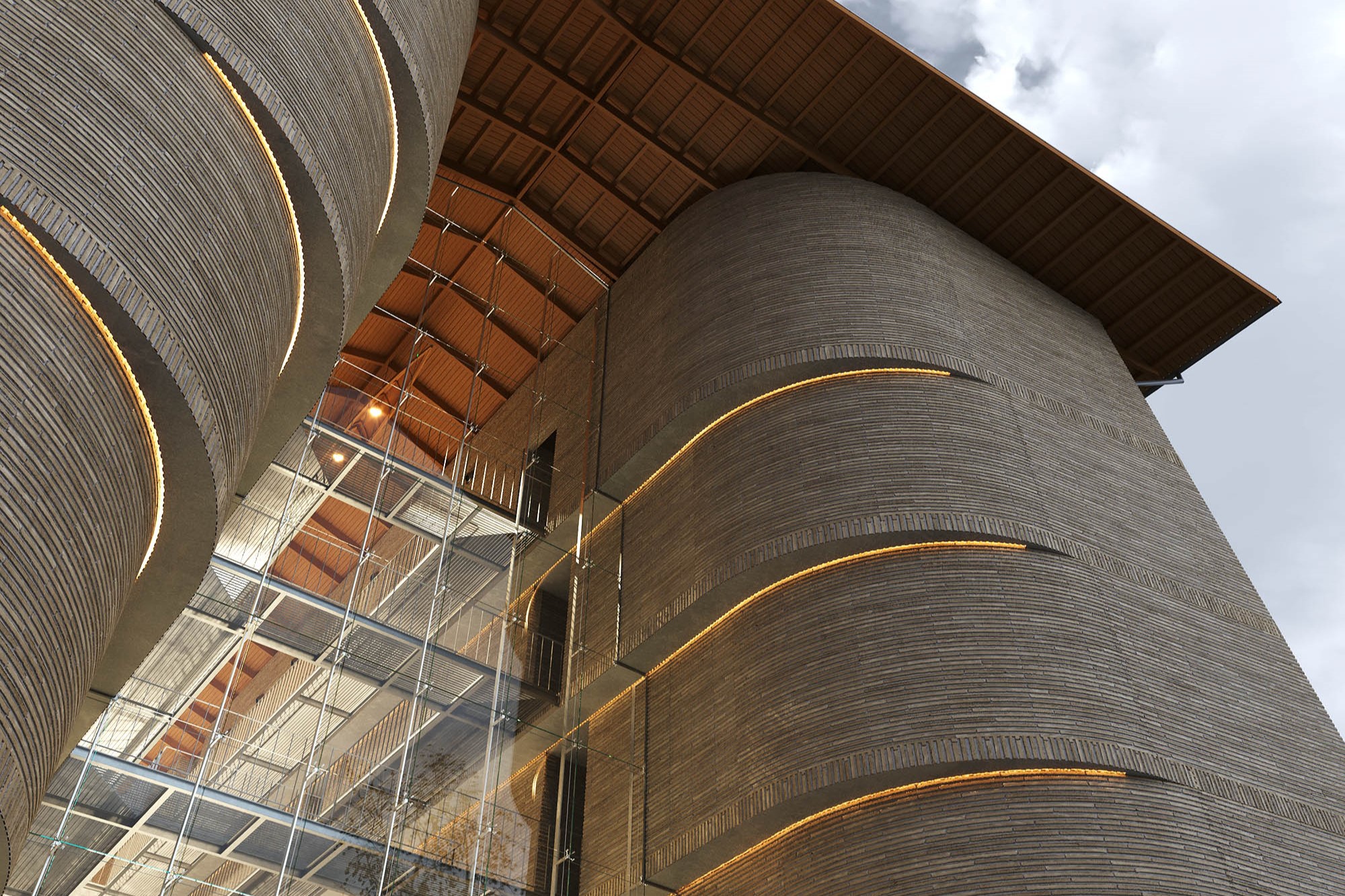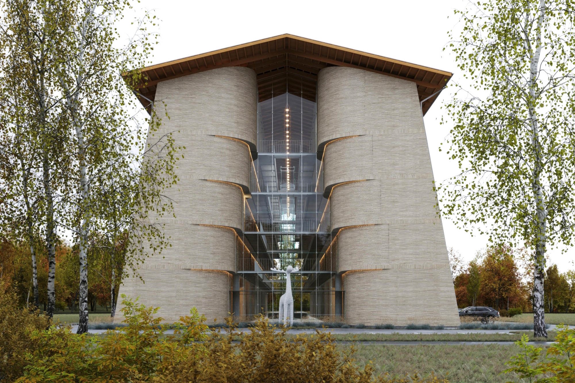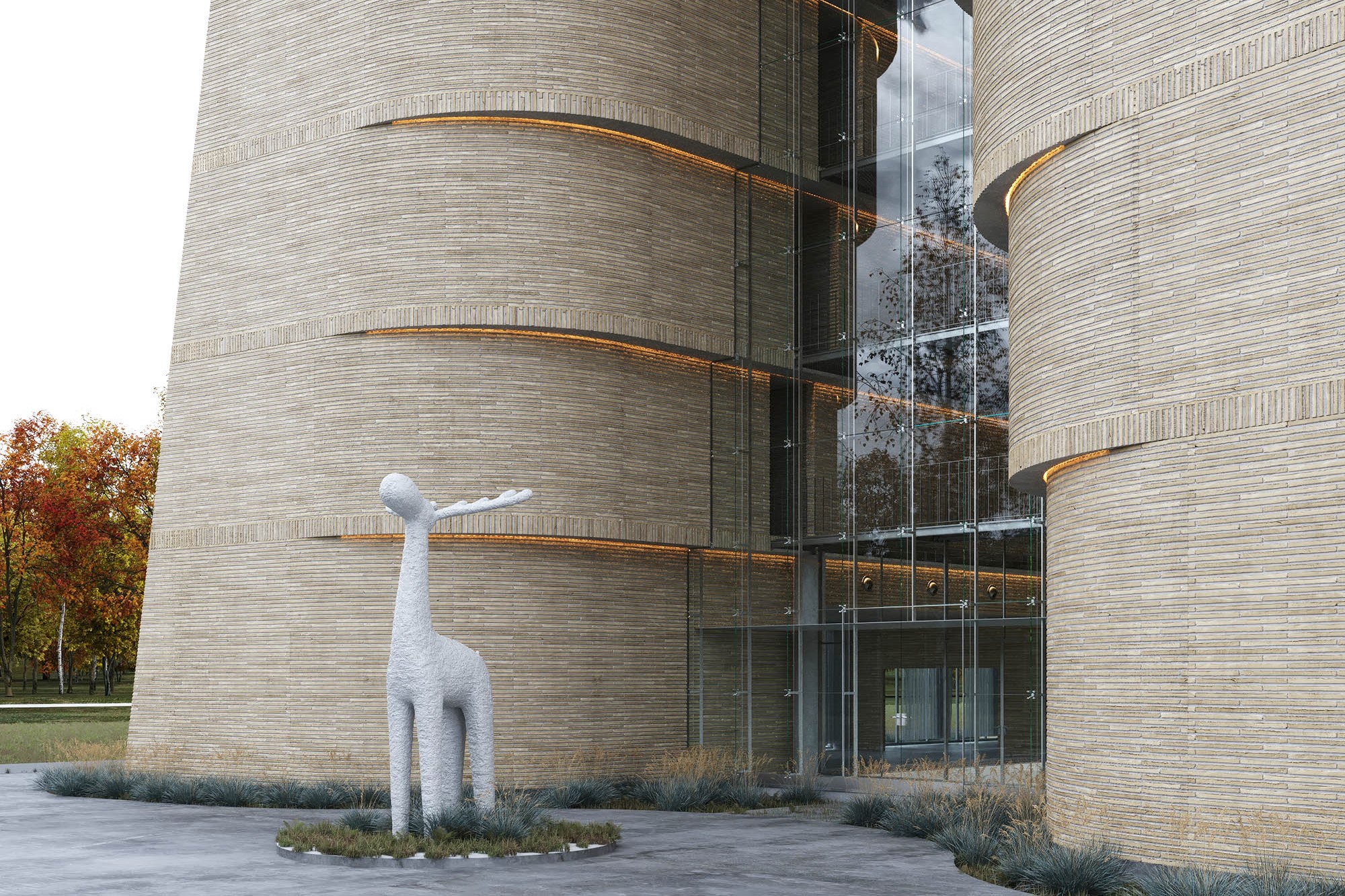 Не испугавшись масштаба здания и поиграв с формой, мы спроектировали две наклонные стены, объединённые между собой большим стеклянным атриумом. Мощные кирпичные стены — это отсылка к крепостям и защитным сооружениям, которые являются визитной карточкой Калининградской области, что хотелось отразить в проекте. Сами фасады постоянно перекликаются с природой — цвет стен повторяет оттенки песчаных дюн, повсюду раскинувшихся на Куршской косе. Здание отеля не противостоит окружению, а вступает с ним в бесконечный диалог, — описывают проект авторы.