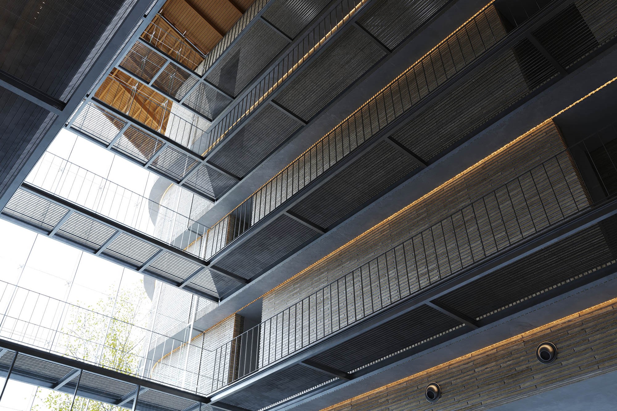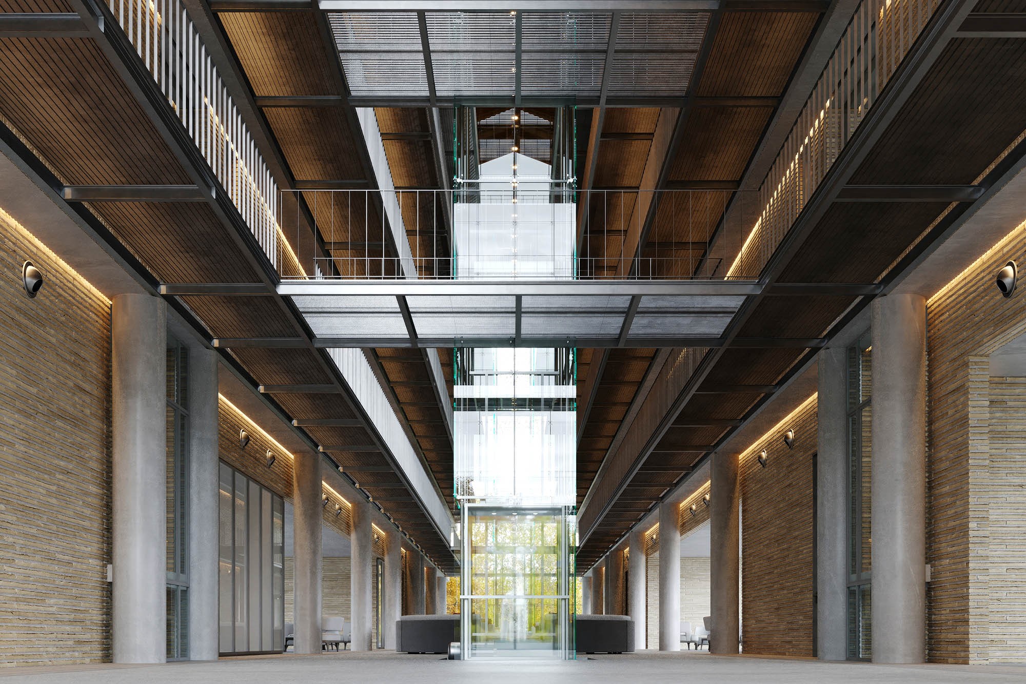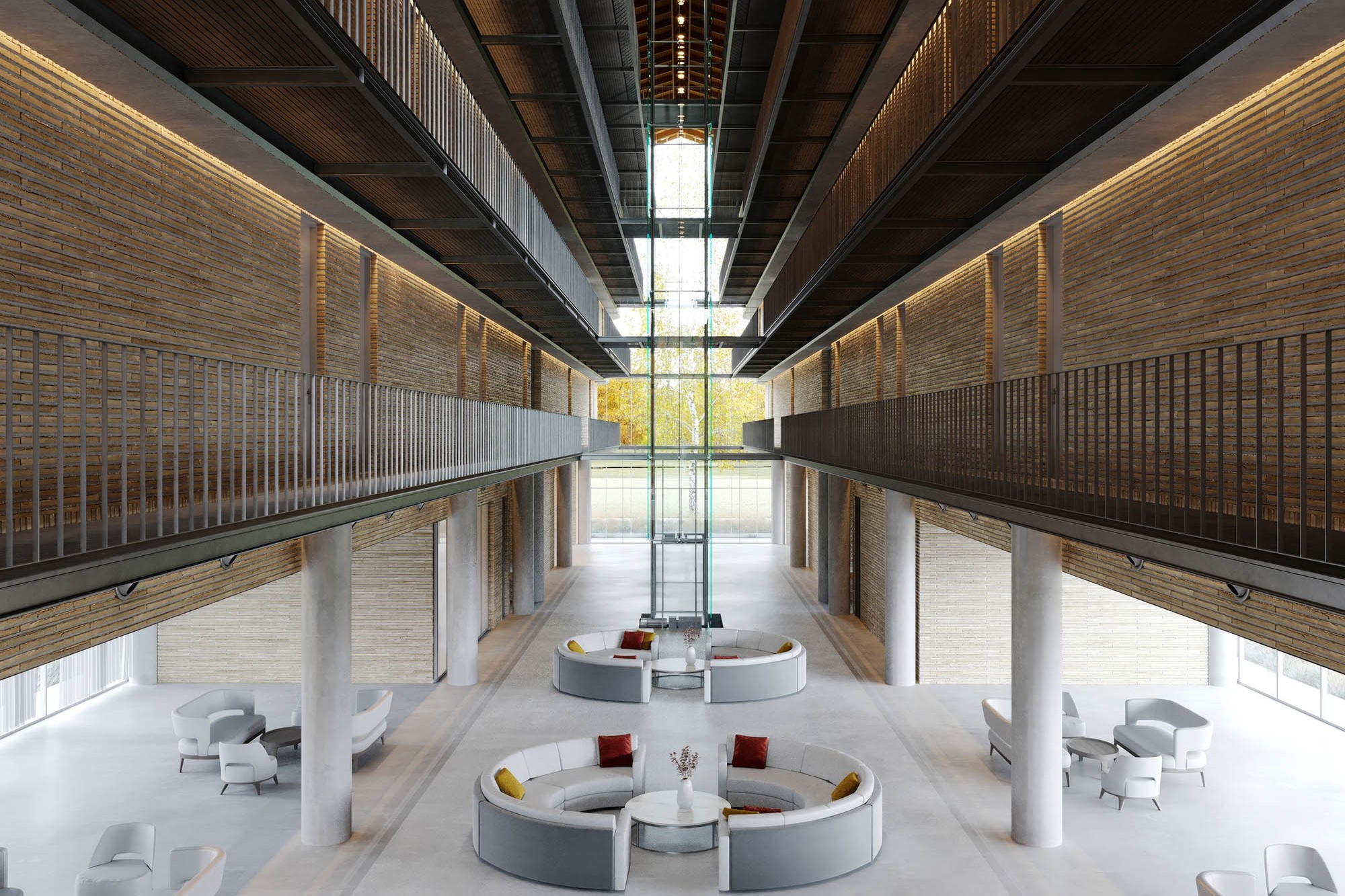 На первом этаже будут находиться рецепция, лобби, ресторан с открытой кухней, пространство под временные экспозиции. Центральным элементом комплекса станет просторный атриум, который объединит все функциональные зоны здания. «Большие окна, пропускающие много естественного света, отражения ветвей деревьев и неба на стекле, игра света и тени создают ощущение единения окружающей природы и внутреннего интерьера», — говорится в описании.