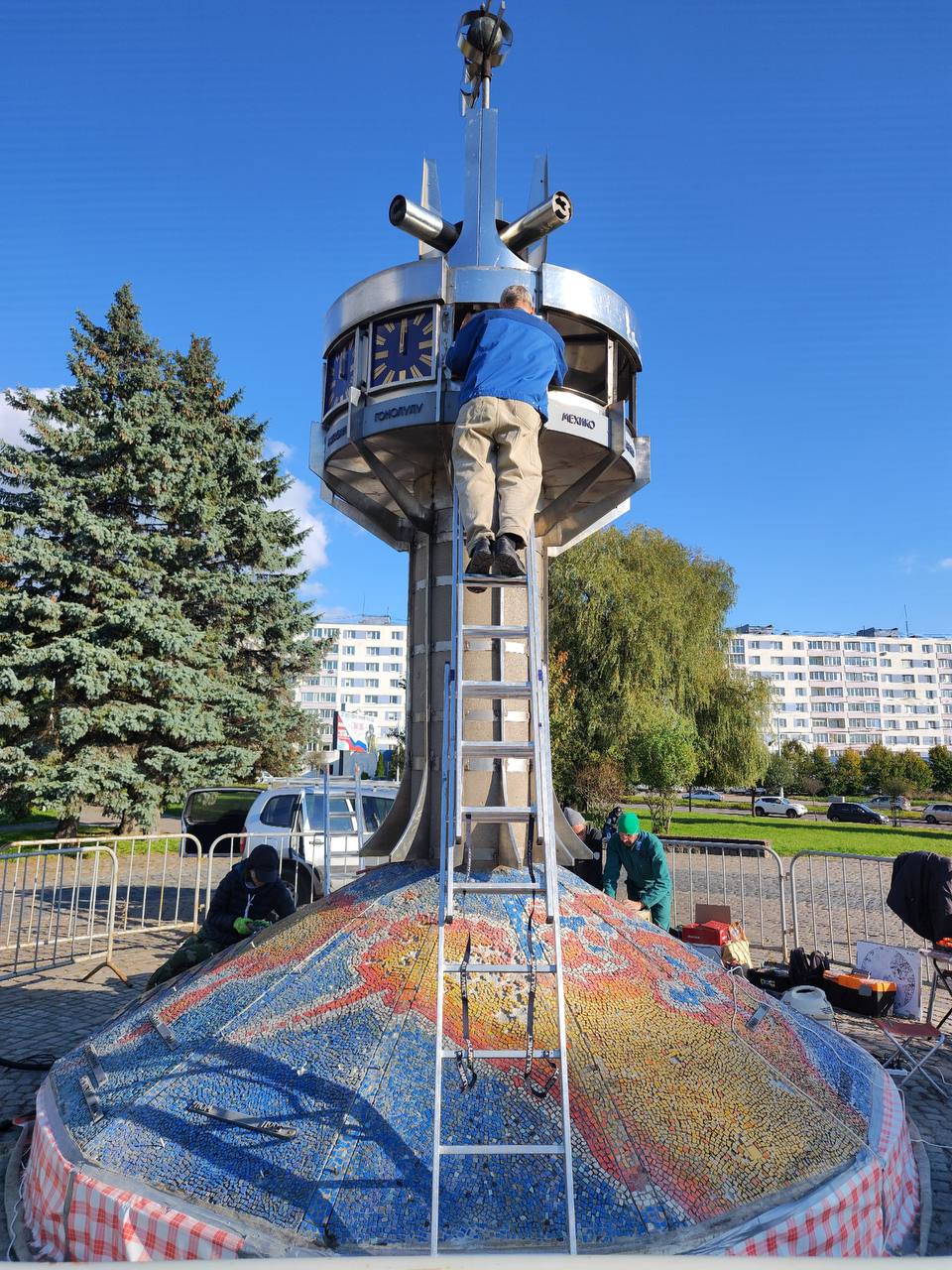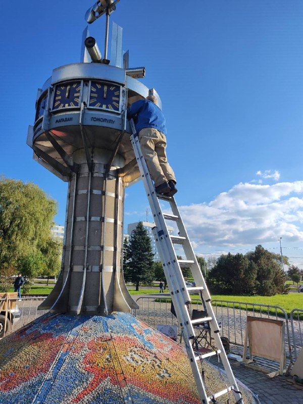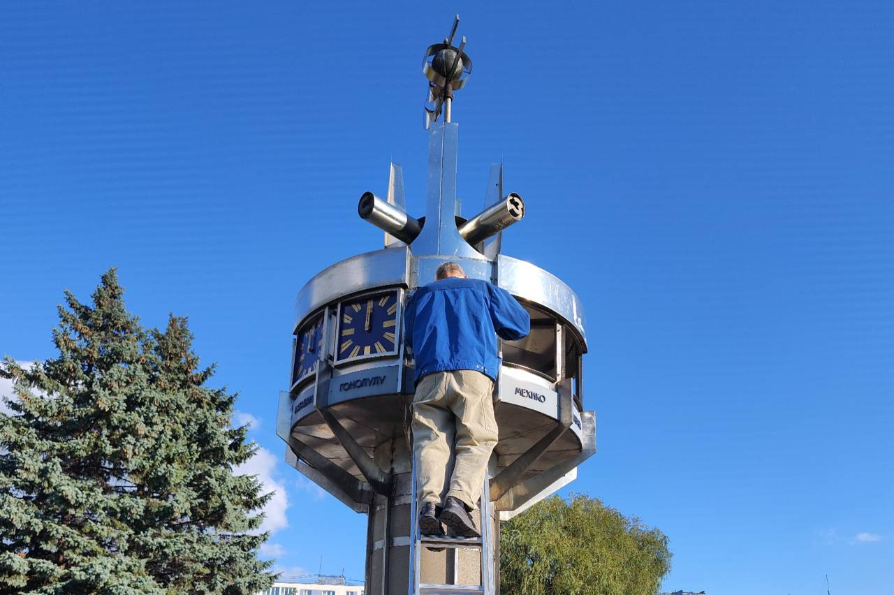 «Часы вернутся, часы будут показывать время. „Часы должны идти!“, — как говорит Александр Кучеренко. Какое-то время он приводил в порядок механизм и циферблаты. Сегодня он должен смонтировать их наверху. Также Александр отольёт таблички с названиями городов для мозаичной карты и установит меридианы, которые ранее были утрачены», — рассказал Мосиенко.