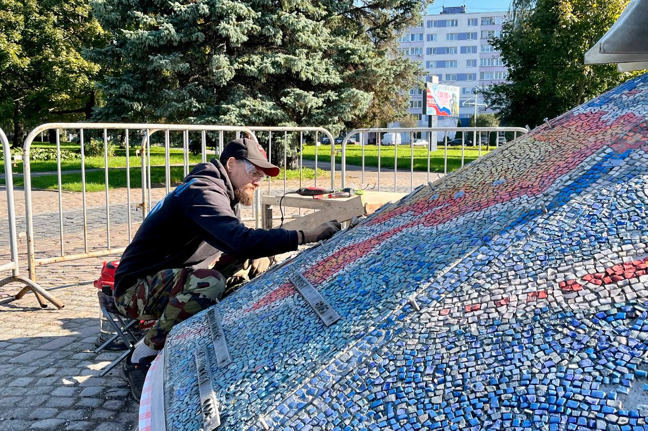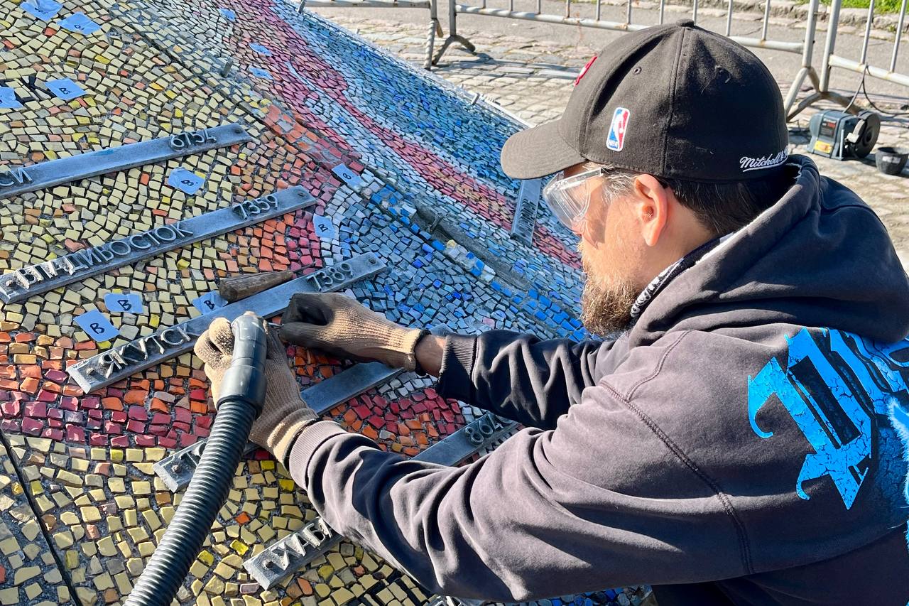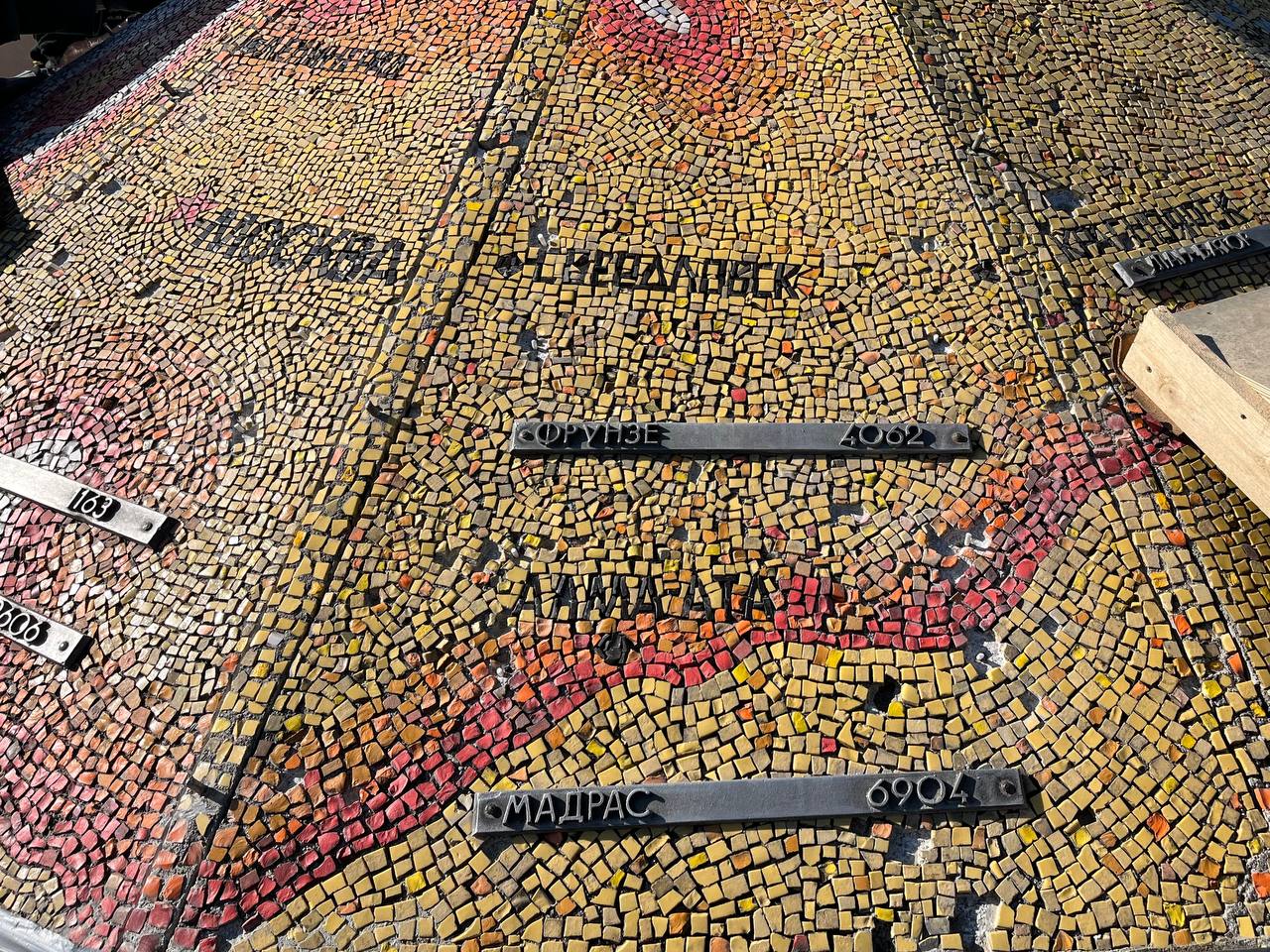 Для восстановления рисунка часов Богдан Лавриненко привёз 37,5 килограммов советской мозаики, которую собирал по всей России. Он подбирал тессеры, сверяя по цвету с плитками оригинального панно. «Набил два багажных чемодана, сделал усиленные колёса, чтобы они не сломались. Даже такие нюансы приходится продумывать! — смеётся Богдан Лавриненко. — У меня в мастерской лежит порядка двух тонн советской смальты».