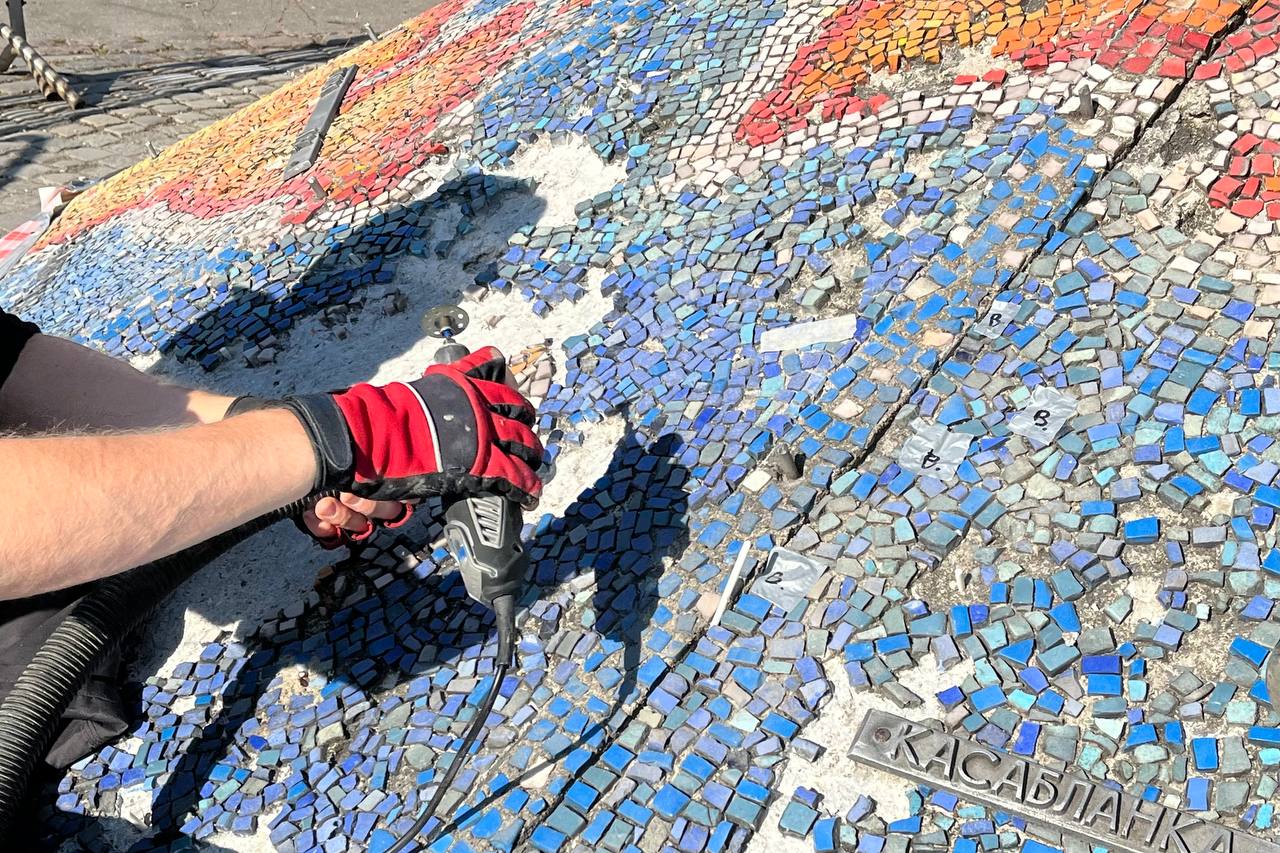 Тем не менее специалистам предстоит большая кропотливая работа. Тая Казанцева объясняет, что реставрация панно проходит в несколько этапов. Сейчас мастера расчищают места, где был утрачен мозаичный набор. В будущем им предстоит заложить недостающие элементы и затереть швы между панелями, которые образуют единый рисунок.