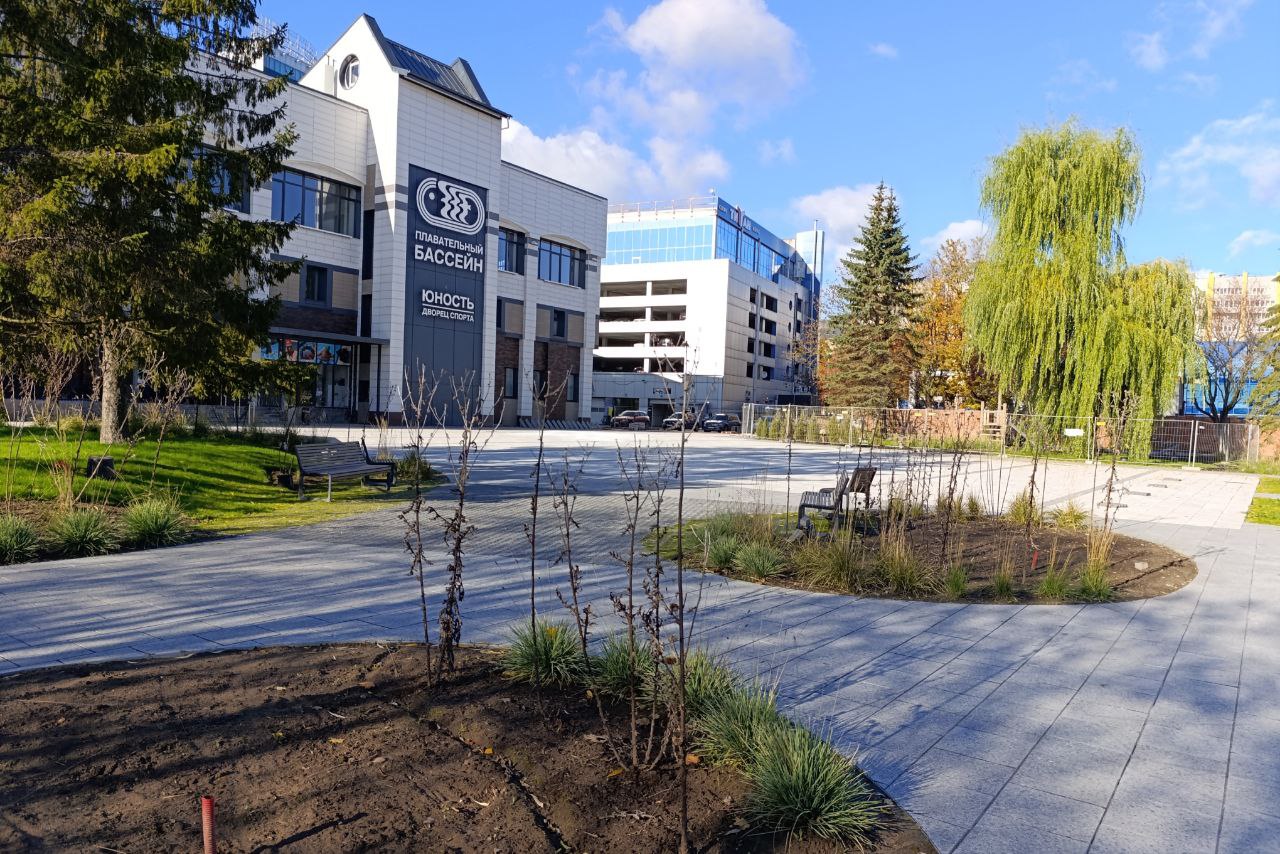На территории парковки высадили деревья и кустарники. На площадке перед входом в бассейн появились новые места для отдыха. Подрядчик смонтировал шлагбаумы на въезде и выезде с парковки. При этом на информационном щите указано, что объект должны сдать только в марте 2026 года.
