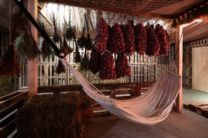 Чтобы добраться до ковчега, надо преодолеть огромную узкую лестницу. Зато сразу после встречает тепло каюты, стога сена, уютный гамак. Если предыдущие помещения тяготели к модному сейчас минимализму, то здесь можно почувствовать себя настоящим путешественником. Но долго предаваться мечтам не получится: вся каюта пронизана сладковатым фруктовым ароматом. То тут, то там из сетчатых мешков торчат алые бока яблок.