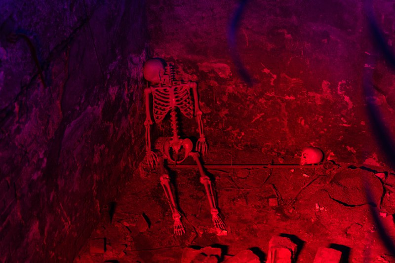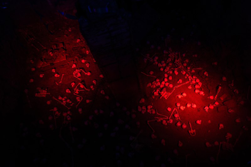 Из каюты стилизованная дверь ведёт на палубу и вместе с тем в подводный мир. Тут пробирает дрожь — и от множества скелетов, что остались на дне, и от пронизывающего холода.