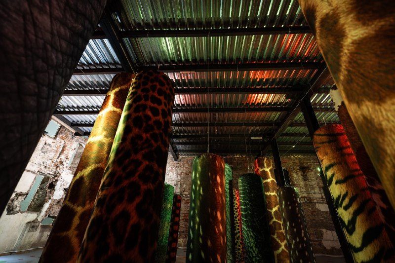 «Потоп» работает на всех уровнях восприятия: здесь важно смотреть, трогать, чувствовать запахи и слушать. Для некоторых помещений в принципе хватает только аудио: настроение задаёт голубиное курлыканье и трепет крыльев. И вот посетители сходят на сушу. Вместе с ними плотно шагают животные. Ну, как шагают: скорее, кружат по своей оси и раскачиваются. Они представлены в форме боксёрских груш разного размера и объёма. И не так-то просто отгадать, где какой зверь: различить слона и носорога станет увлекательным испытанием.