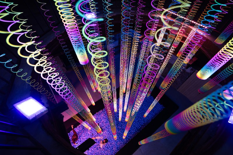 Поток ниспадает в бассейн с «водой»: это символ спасения и крещения, помогающего оказаться в новом духовном мире. А ещё это занимательная иммерсивная локация. Каждый может спуститься по ступенькам и «поплавать» в сине-белых шариках.