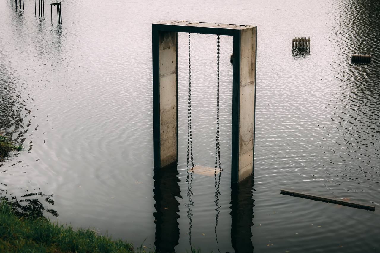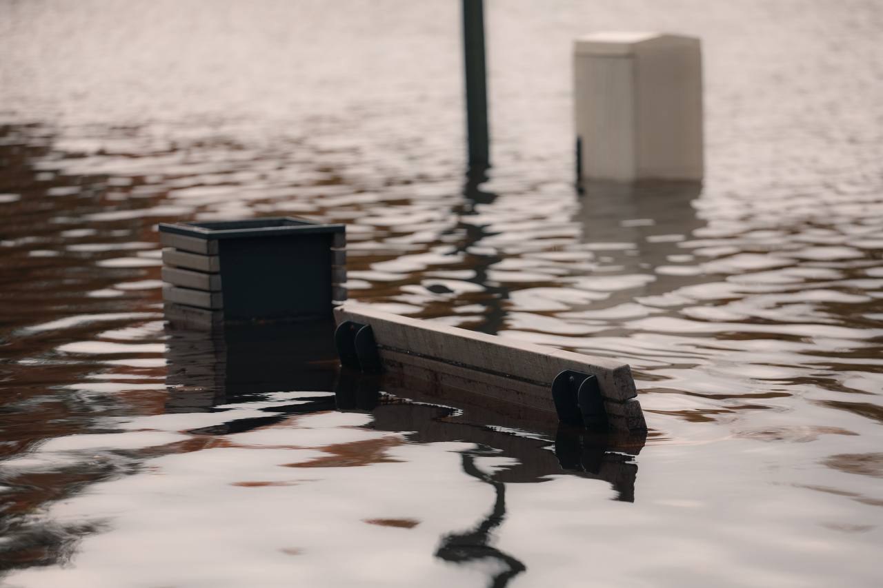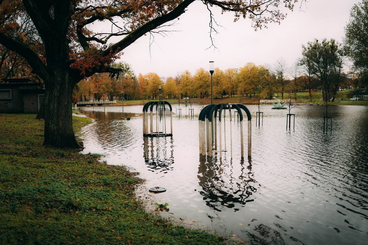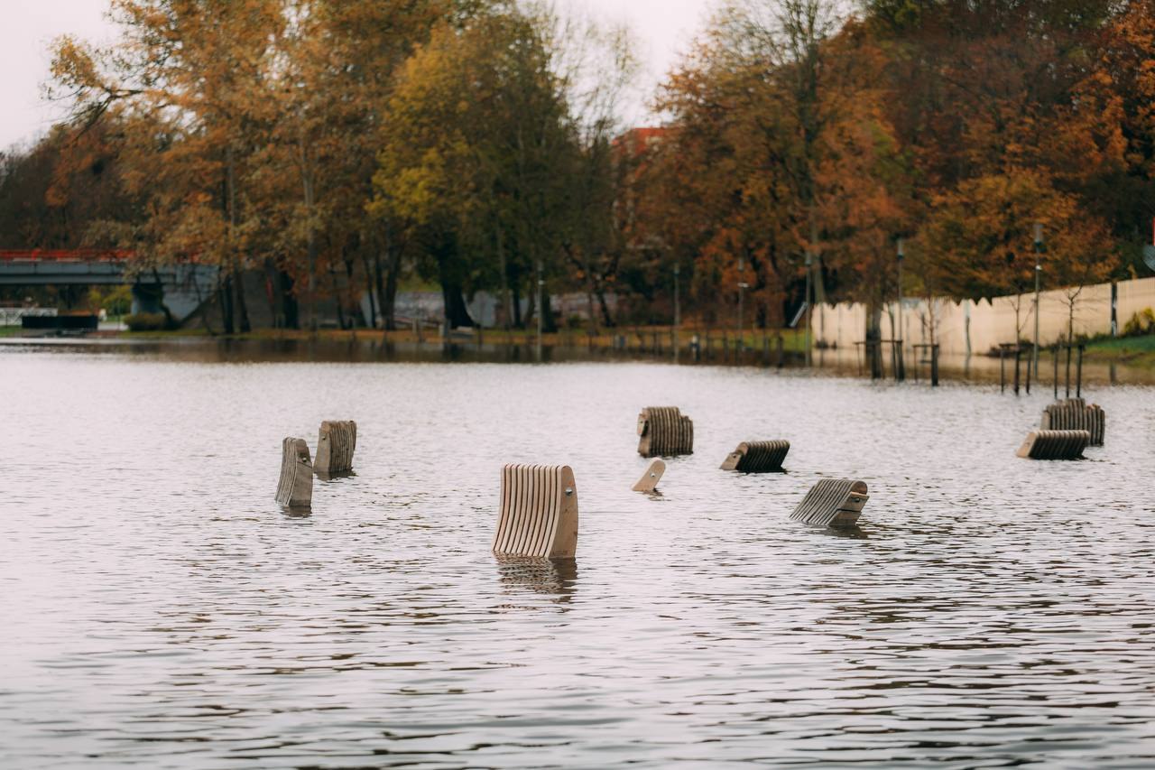Городской парк затопило после обильных дождей. Под водой оказались лавочки, саженцы, урны, качели и множество других объектов. Некоторые из них затопило практически полностью.