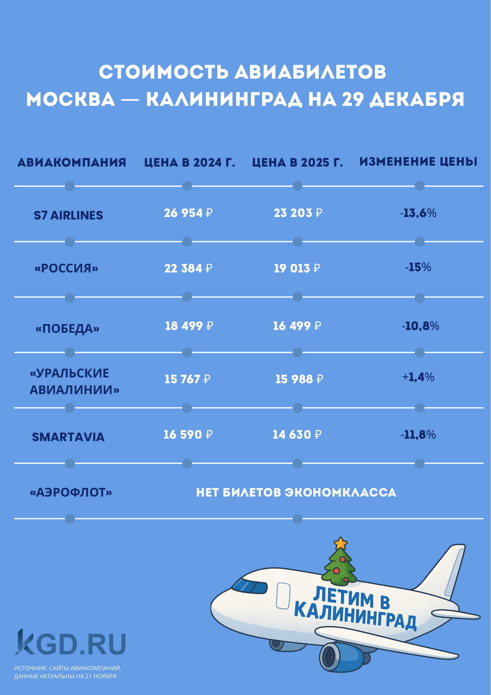 «Победа». Улететь из Москвы в Калининград 29 декабря можно минимум за 16 499 рублей. За год стоимость билетов снизилась на 10,8%.