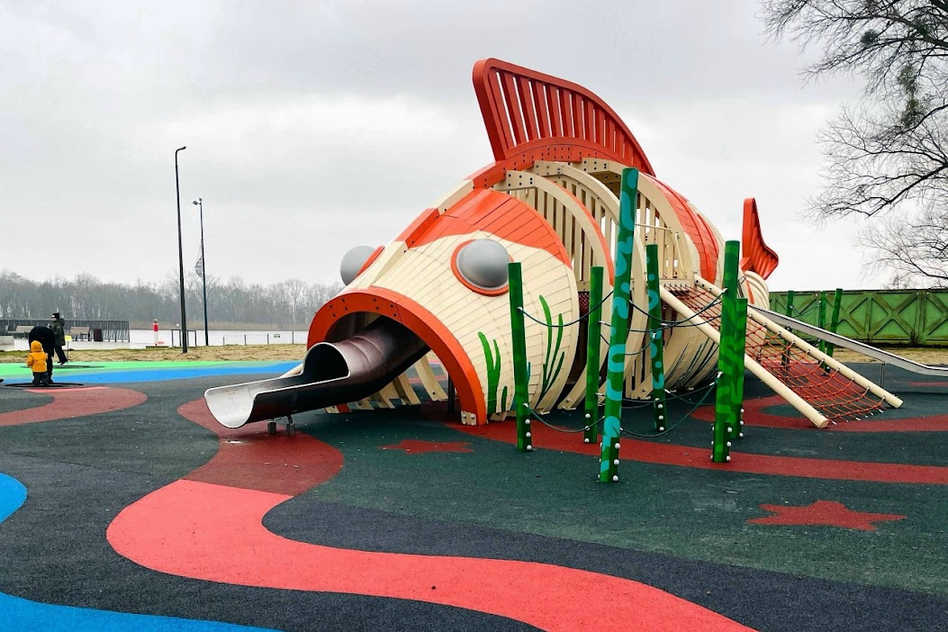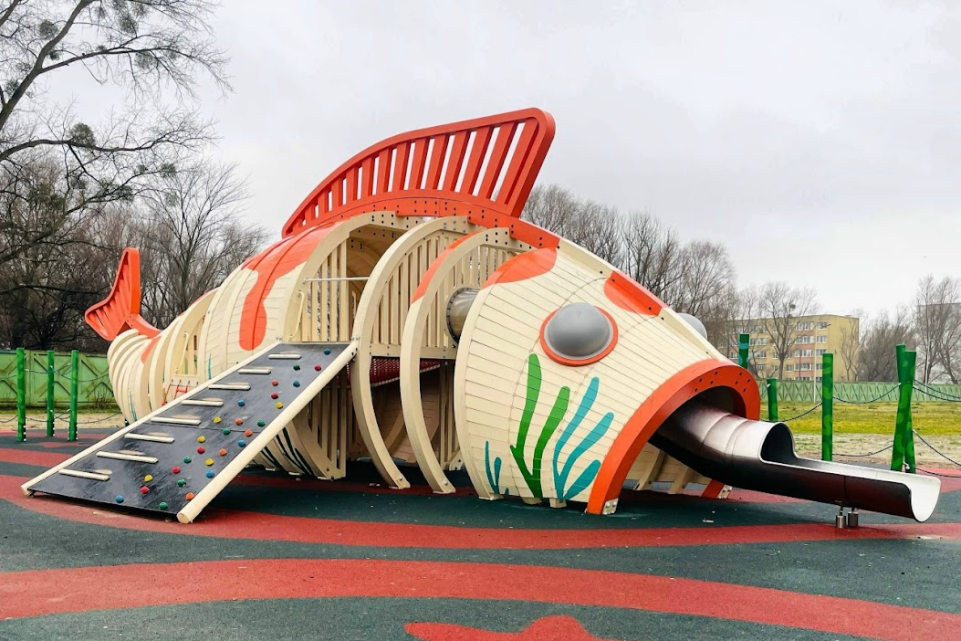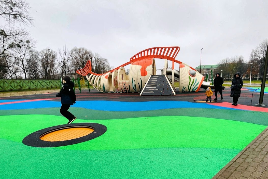 Игровой комплекс начали устанавливать в конце июня. «Это будет не просто площадка, а настоящий тематический арт-объект, выполненный в виде рыбы. Уверен, она обязательно понравится нашим юным жителям и станет одной из любимых точек на прогулке по набережной», — обещал Бевз.