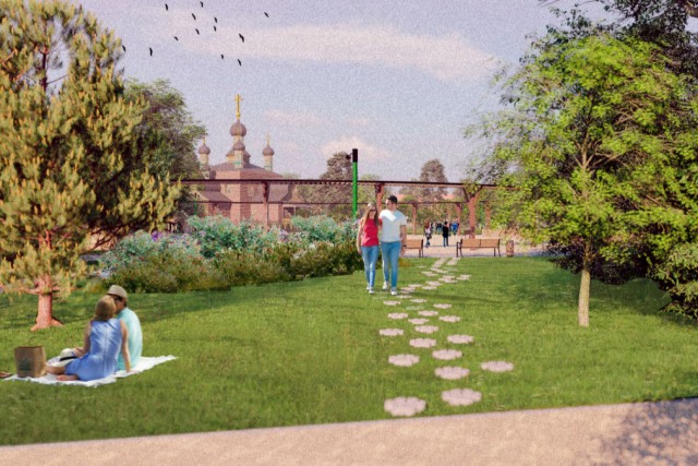 Рядом с церковью планировали организовать территорию для проведения ярмарок с деревянными павильонами. По дорожке с зелёной аркой, украшенной подсветкой и девичьим виноградом, можно будет пройти в западную часть, где обустроят экопарк «Наша земля». Там хотели сделать места отдыха с гамаками, «босоногую тропу» с разными типами покрытий, искусственный холм с дорожками и тематическими площадками, посвящёнными разным географическим точкам Земли.