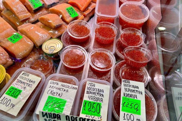 Икры форели на момент посещения торговых рядов на прилавках представлено не было. В прошлом году она стала самым бюджетным вариантом с ценой в 6500 рублей за килограмм.