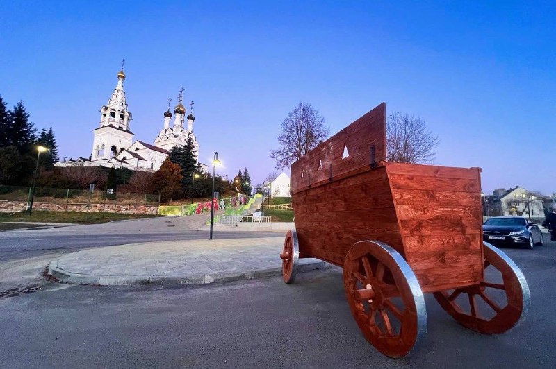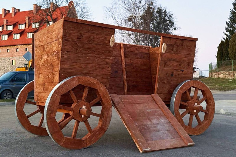 В Средние века такие телеги использовали для обустройства военных укреплений. Повозку расположили недалеко от исторического сооружения, гости могут подняться внутрь экспоната.