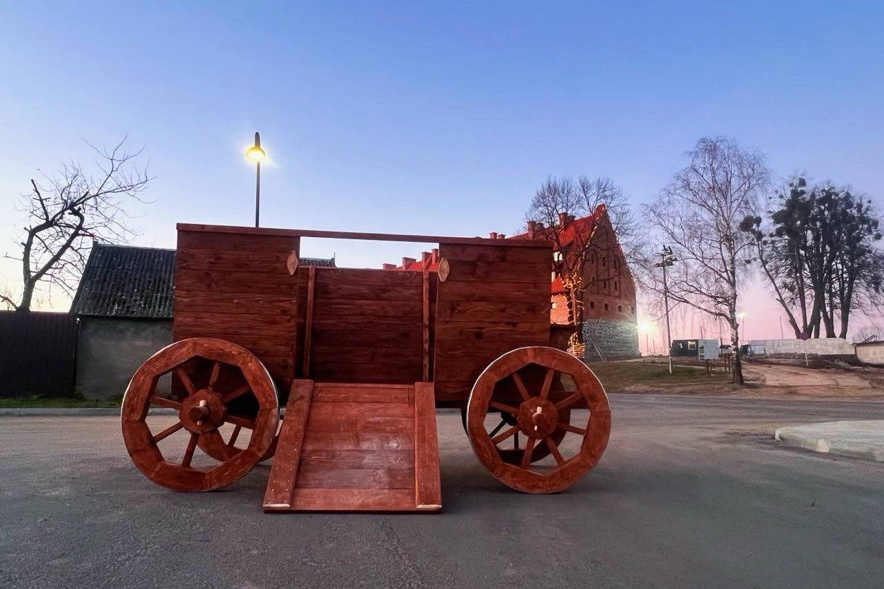 «Перед самым снегопадом, который пришёл в праздничные дни, в форбург замка был доставлен особый экспонат, созданный мастерами по средневековым эскизам, — боевая повозка (телега). Что особенно радует — доставлен своим ходом», — говорится в сообщении.