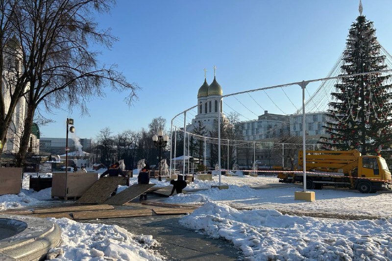 Как передаёт корреспондент Калининград.Ru, рядом с ёлкой стоит специальная техника. Рабочие устилают территорию вокруг деревянными листам.
