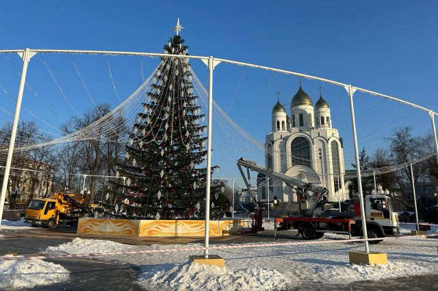 Новую праздничную ёлку в Калининграде приобрели в конце 2025 года. Высота дерева составляет 18 метров, ширина светящегося шатра — 40.