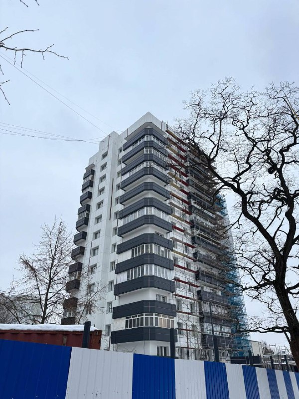 Подрядчик снял строительные леса с половины здания. Специалисты выполнили устройство вентиляционной фасадной системы. Рабочим предстоит также привести в порядок входные группы, цоколь и отмостку.