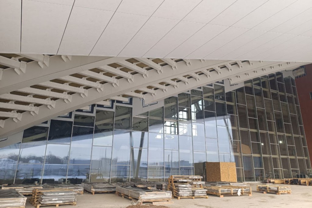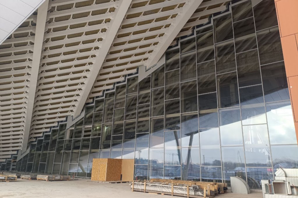 Самой масштабной работой стало остекление витража, расположенного под консольной частью несущей фермы. Отмечается, что он напоминает гигантский «стеклянный парус» и собран из 242 двухкамерных стеклопакетов.