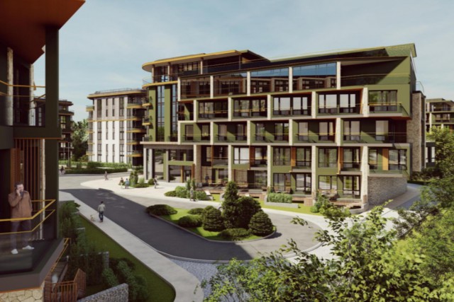 Здания собираются выполнить в современном стиле. В отделке используют натуральный камень, дерево, металл, штукатурку. На въезде предложили обустроить кольцо с фонтаном в центре. На территории хотят сделать общественные пространства: зоны отдыха, пруд, детские площадки и другие.