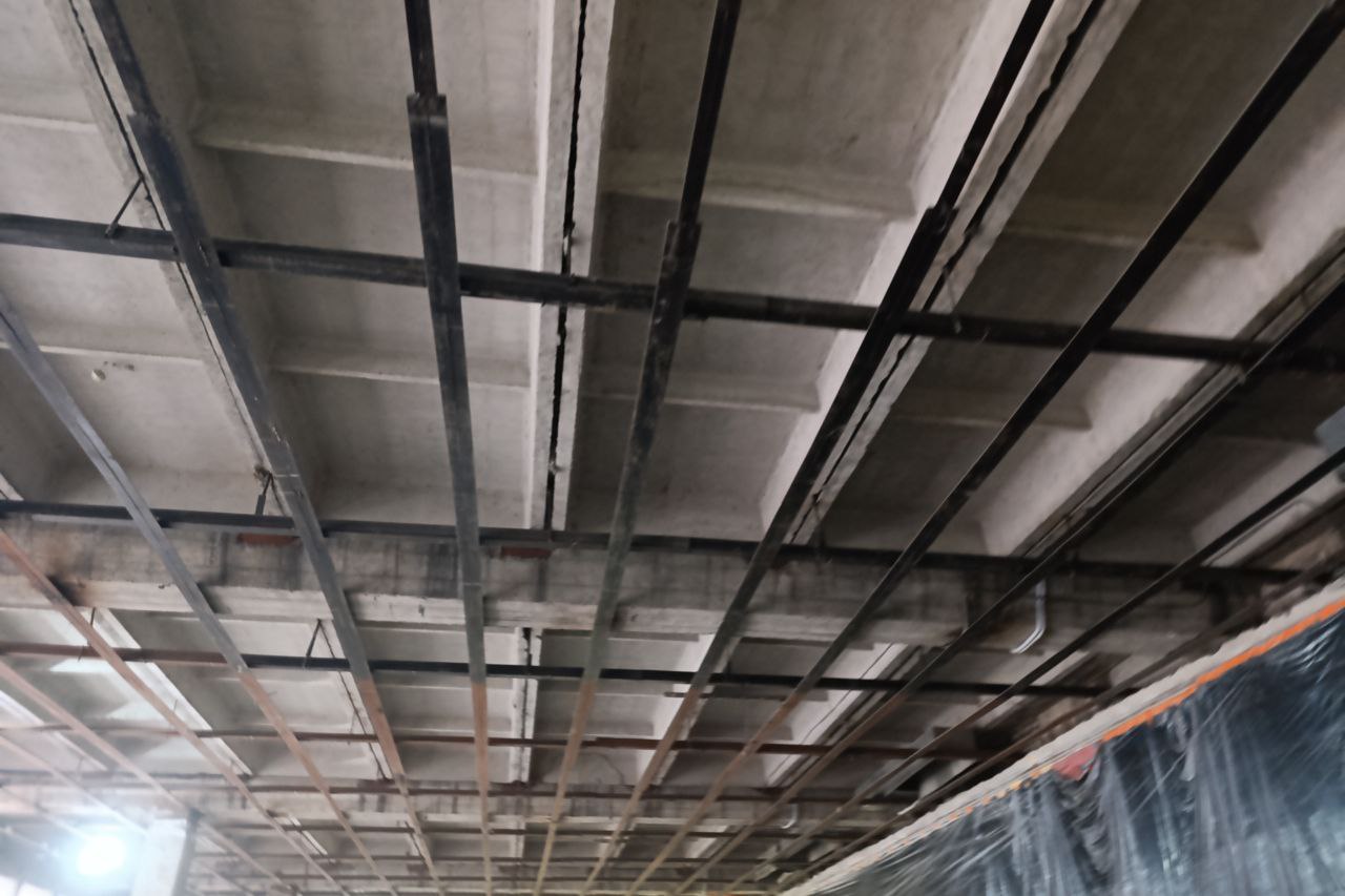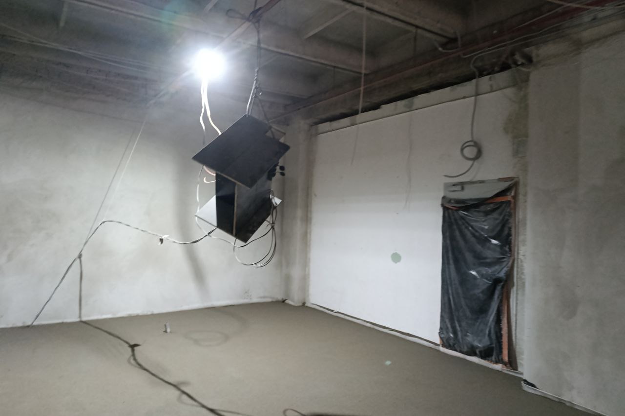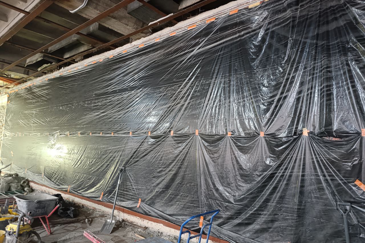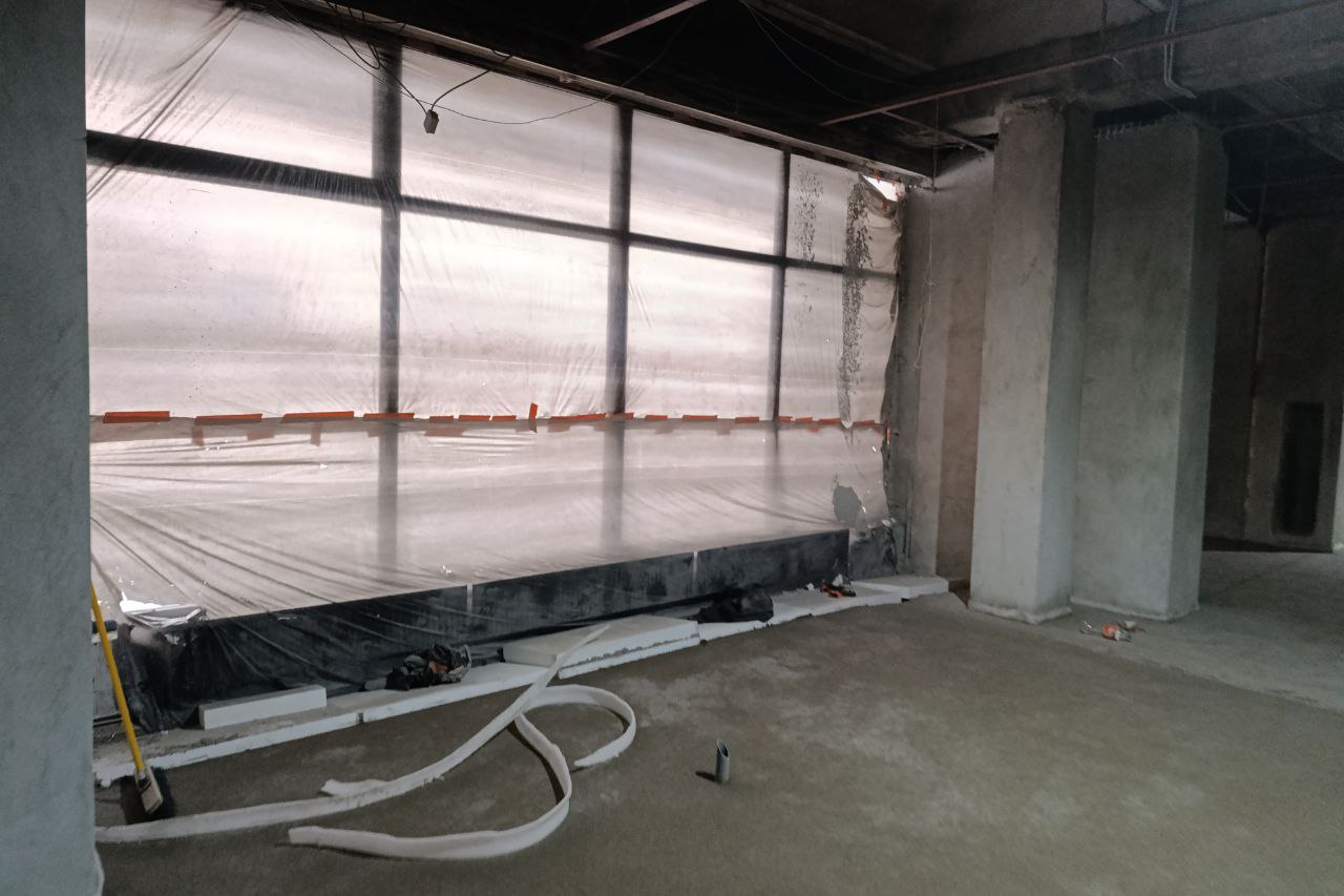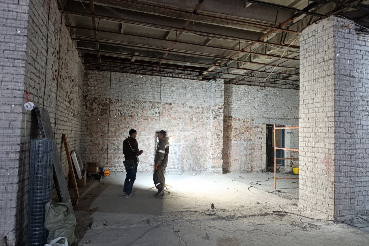 Сейчас специалисты работают в фойе первого и второго этажей. Все старые покрытия уже демонтировали, идёт заливка новых. Также обустроили дополнительный пожарный выход.