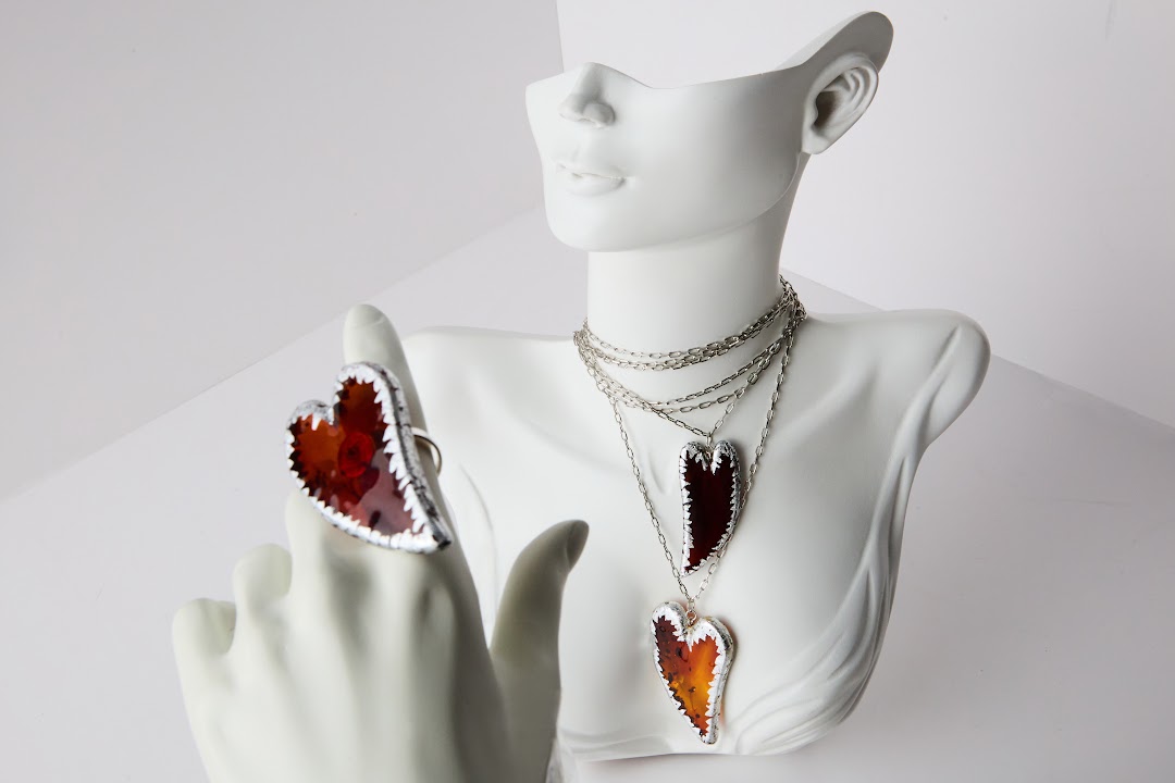 Поталь представляет собой сплав меди с цинком или алюминием, раскатанный в тончайший лист. Материал позволяет добиться визуального сходства с сусальным золотом и серебром. В новой коллекции украшений поталь используют вместе со светлым янтарём и камнем тёмных оттенков. Сплавом декорированы кольца и подвесы в виде сердец.