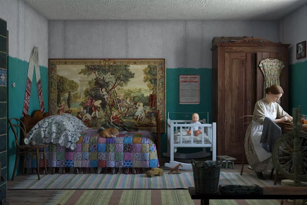 В рамках проекта учёные создали четыре панорамных вида дома: кухня, комната родителей с грудным ребёнком, общая комната и прихожая. Особое внимание сосредоточили на сложной предметной среде жилища: лоскутные одеяла, печь, деревянная утварь, керосиновые лампы, бюст Сталина, патефон, портреты вождей, тетради с кляксами, половики. Прототипом внешнего оформления пространства стал дом 1930-х годов в Правдинске.