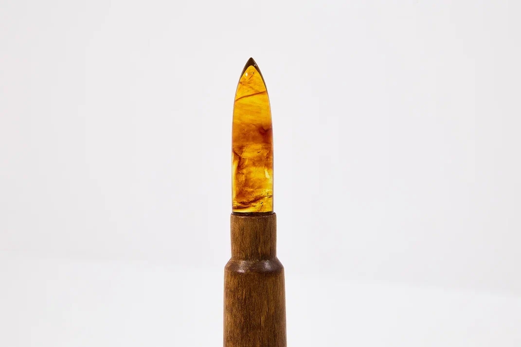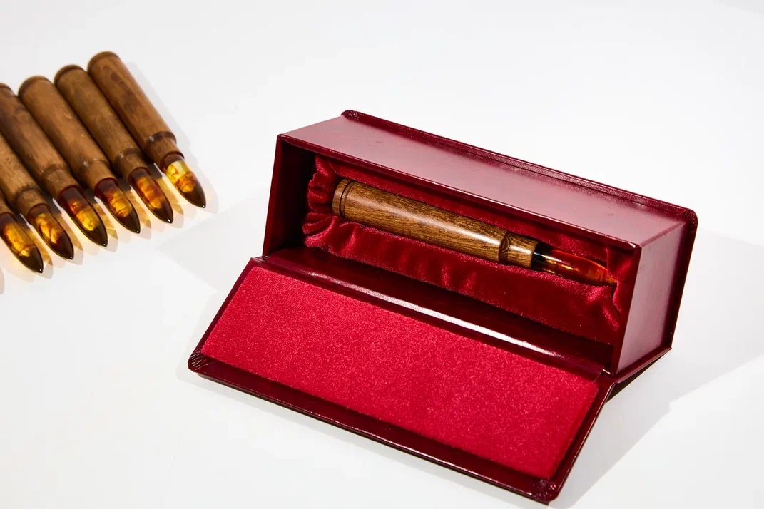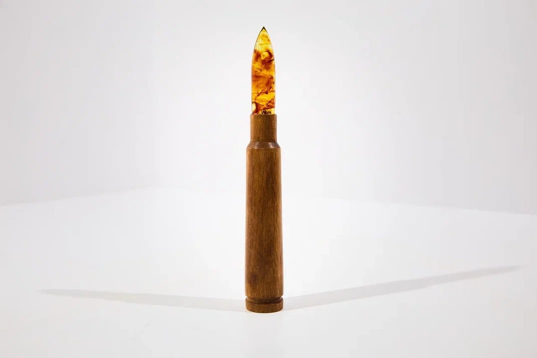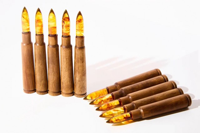 Гильзу патрона выполнили из бука, а пулю — из солнечного камня. Всего на комбинате создали 60 изделий. За образец взяли патрон для советского пулемёта «Утёс».