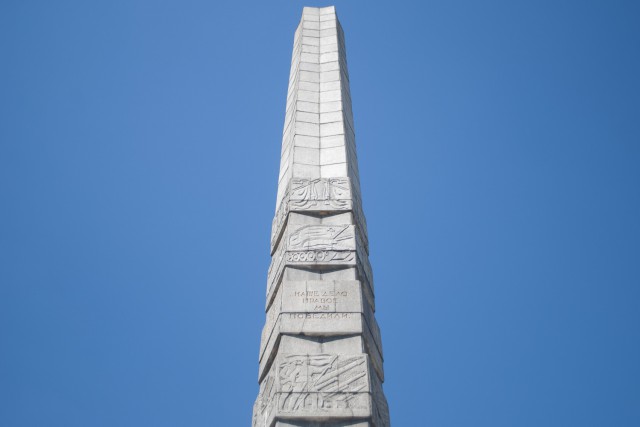 Мемориальный комплекс создала группа литовских скульпторов и московских архитекторов. На овальной площади возвышается 26-метровый каменный обелиск, в основании которого — пятиконечная звезда. Стелу украшают семь поясов с эпитафиями. Грани покрыты рельефами с изображениями медалей, орденов, оружия и сцен сражений, а также портретом Иосифа Сталина. Спустя год после открытия обелиск дополнили скульптурными композициями «Штурм» и «Победа», а в 1960-м зажгли Вечный огонь.