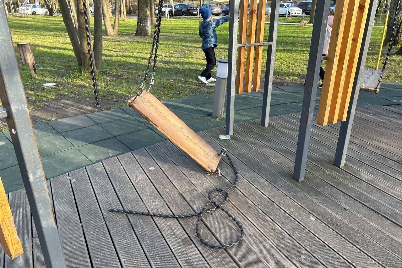В сквере «Вектор» в Зеленоградске ломают отремонтированные лавочки-качели. Как передаёт корреспондент Калининград.Ru, у одной конструкции оторвано крепление цепи, часть сиденья лежит на земле.