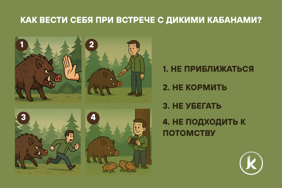 - Не паниковать и не убегать. Кабаны быстрее человека, поэтому бегство может усилить агрессию. Сохраняйте спокойствие и не делайте резких движений.